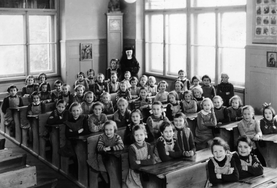 Sr. Hyazintha Brunner (1896 – 1980) kam aus dem Kanton Aargau ins Institut St. Klara nach Stans – zuerst in die Haushaltungsschule und später ins Lehrerinnenseminar. Nach einigen Wanderjahren kehrte sie im November 1922 ins Kloster nach Stans zurück. Sie war fast 50 Jahre im Mädchenschulhaus (Kniri) Lehrerin in der 1. und 2. Klasse. Das Bild zeigt eine 1. Klasse im Februar 1954.