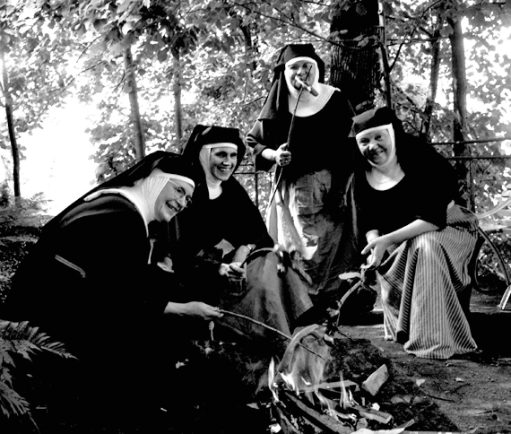 Schon in den 1960er-Jahren gehörte das Wurstbräteln im Klosterwäldchen zu einer tollen Gemeinschaftserfahrung: Von links nach rechts: Sr. Regina Maria Egle, Sr. M. Stéphanie Steger, Sr. M. Emmanuela Voit, Sr. M. Assunta Morger.